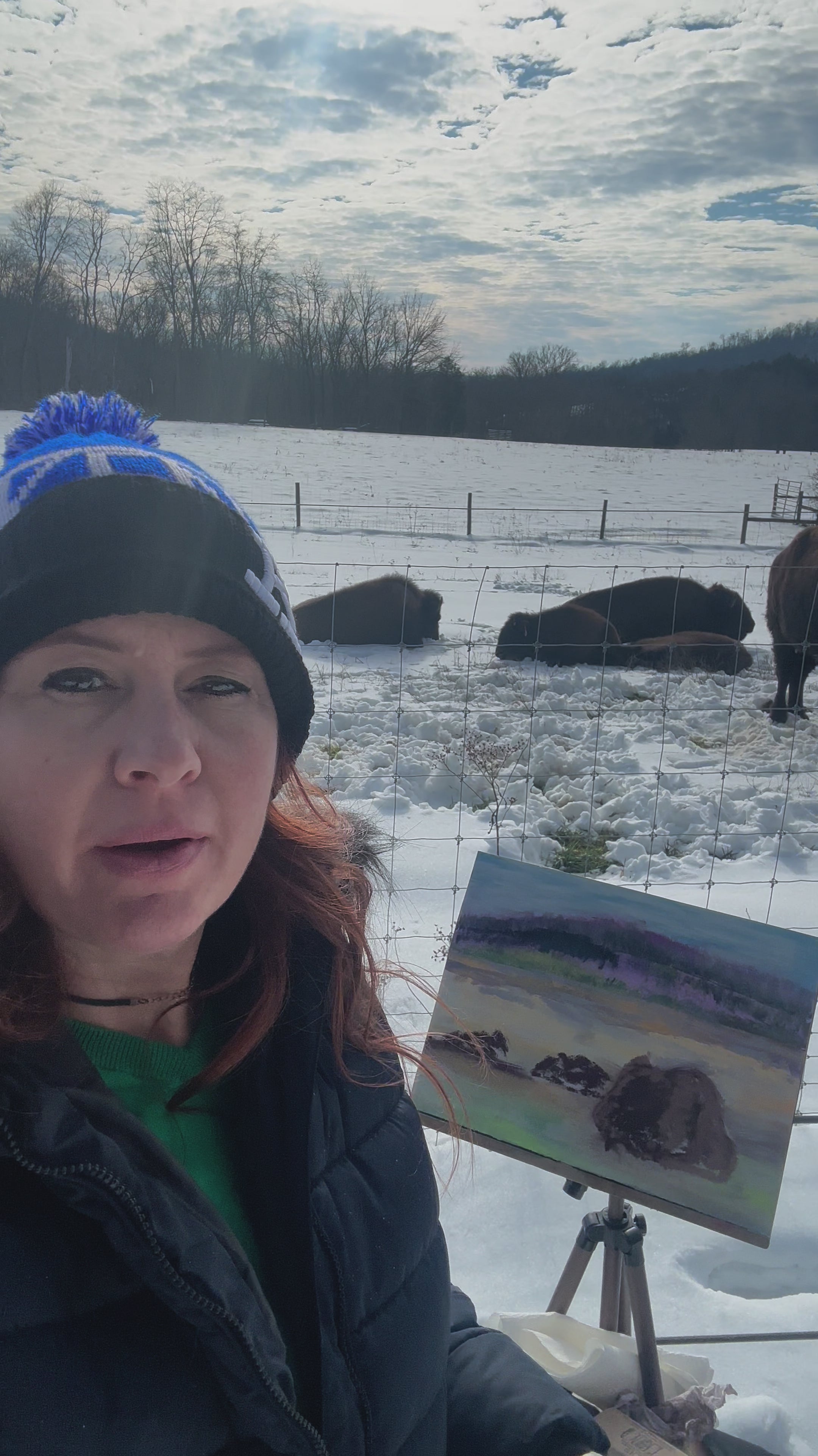 I painted bison en plein air at Big Bone Lick Historic State Park in northern Kentucky after a snow in January. The bison seemed to be having a ball in the snow, licking it, and pawing it...they were extra animated and loved running around in it. Kentucky doesn't get a lot of snow, so these guys seemed to be really enjoying it!