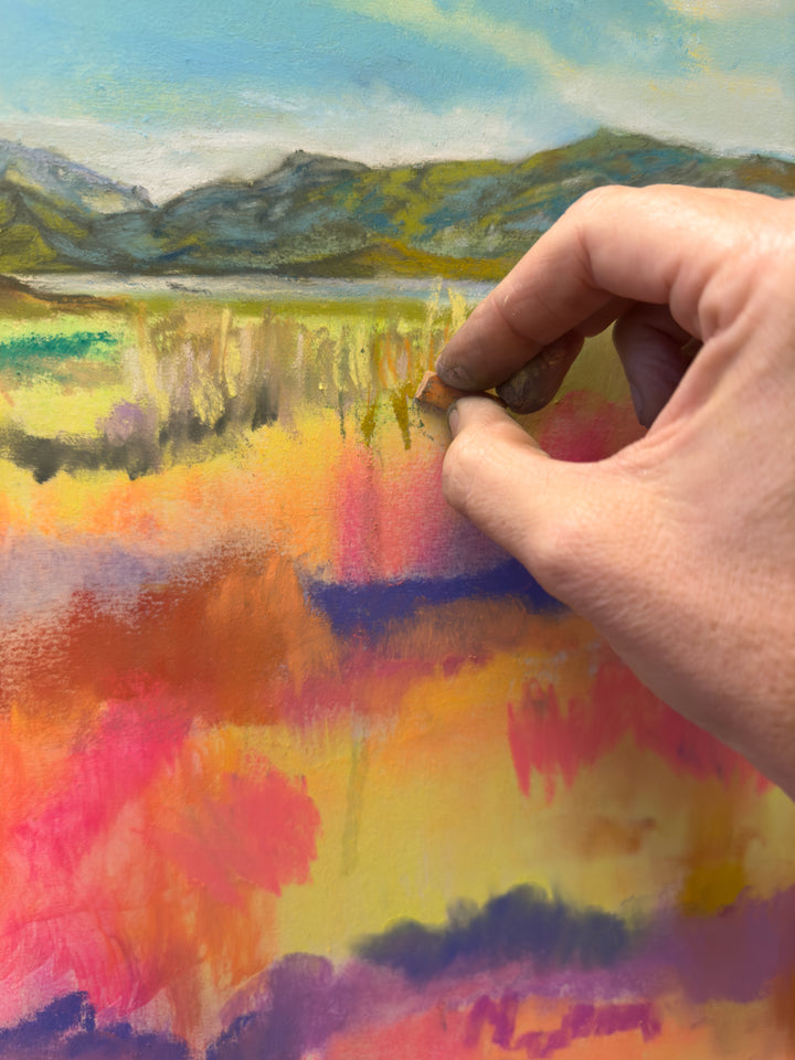 Although I reside in Kentucky, much of my family lives in Arizona, so I spend time each year in the Sonoran desert. The colors of the desert come to life in the fall and spring. I attempted to capture the essence and vibrancy of the vegetation and foothills surrounding the desert in this piece.